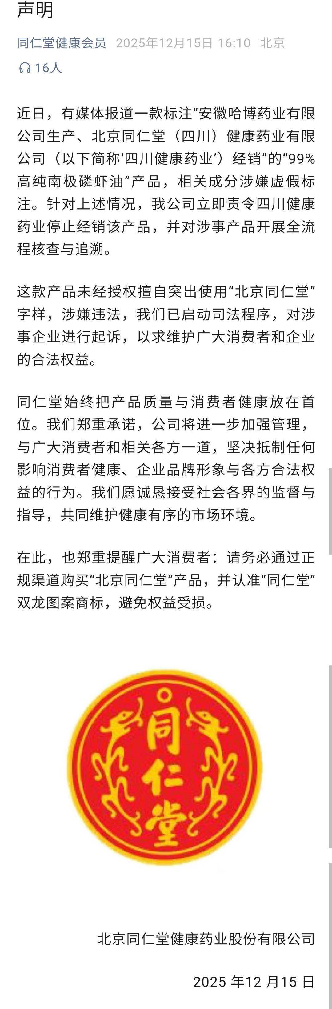 极目新闻记者注意到,15日,同仁堂健康会员官微发布了北京同仁堂健康药业股份有限公司的声明。声明称,公司立即责令四川健康药业停止经销该产品,并对涉事产品开展全流程核查与追溯。这款产品未经授权擅自突出使用“北京同仁堂”字样,涉嫌违法,公司已启动司法程序,对涉事企业进行起诉。