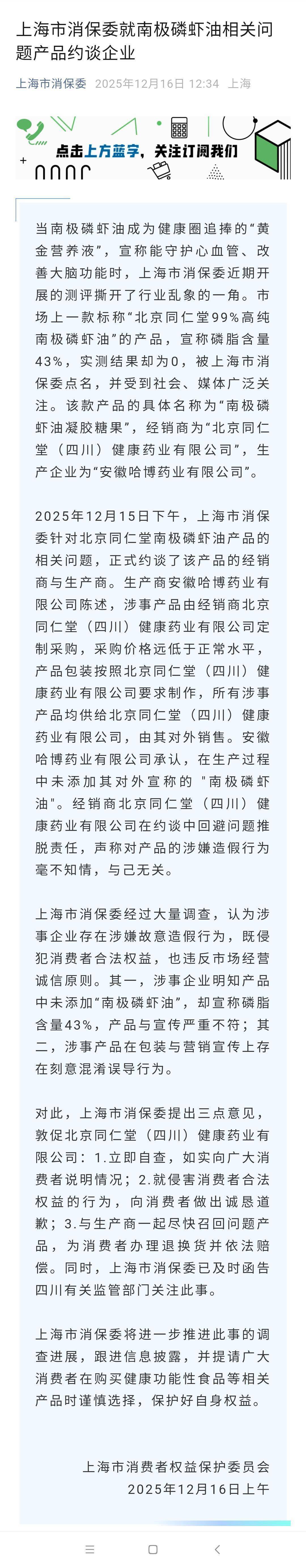 近日,上海市消费者权益保护委员会在官微发文表示,一款标称“北京同仁堂99%高纯南极磷虾油”的产品磷脂标识值为43%,实测结果却为0。12月16日上午,上海市消保委继续发文表示,涉事企业存在涉嫌故意造假行为。16日,生产企业所在地的市场监管部门告诉极目新闻记者,对此正在调查。