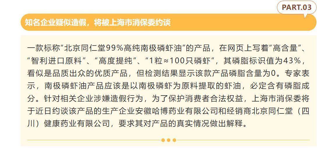 上海市消费者权益保护委员会官微在12月11日发布信息称,上海市消保委委托中国水产科学研究院东海水产研究所,对市面上热销的15款国内外南极磷虾油产品开展了检测和调查。调查中发现一款标称“北京同仁堂99%高纯南极磷虾油”的产品,在网页上写着“高含量”“智利进口原料”“高度提纯”“1粒≈100只磷虾”,其磷脂标识值为43%,但检测结果显示该款产品磷脂含量为0。