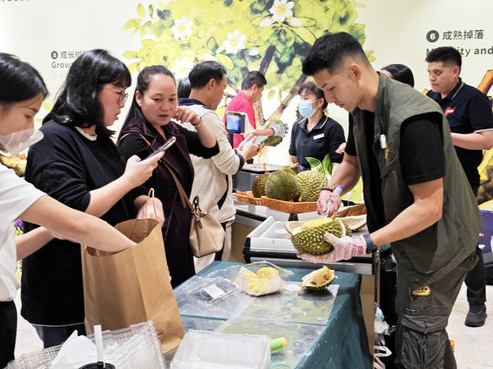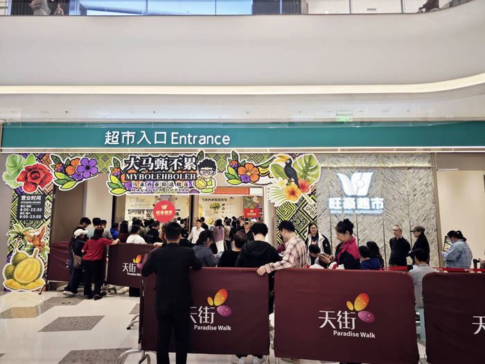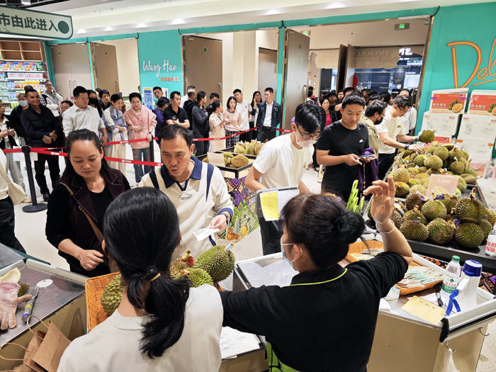 当日中午,龙华区龙湖海南海口天街旺豪超市内暖意融融、人头攒动。马来西亚华人短视频博主、马来西亚榴莲推广大使“马来堂哥”亮相现场,向市民群众细致介绍榴莲品种特色、跨境物流流程,并不时为大家挑选、分装鲜果。超市外,市民们自觉排起蜿蜒数十米的长队,在工作人员的有序引导下,依次进入选购区挑选心仪的榴莲。